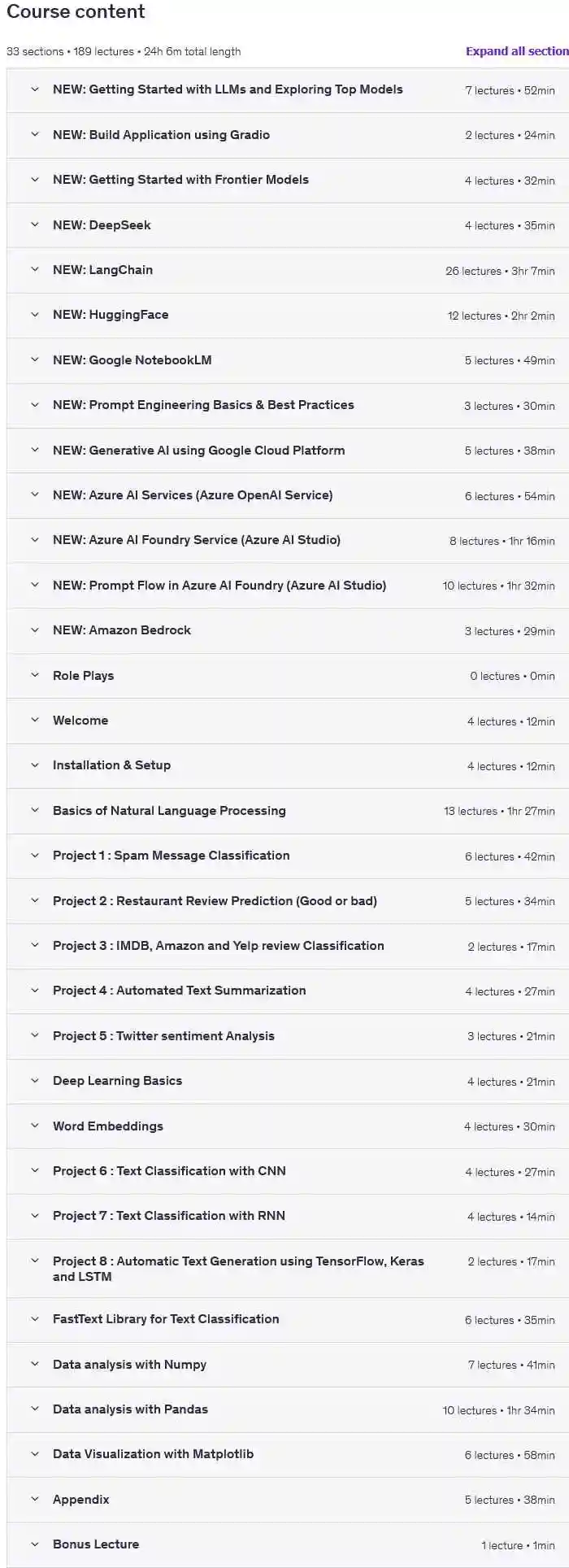 این دوره بیش از 18 ساعت محتوای ویدیویی HD و 8 پروژه عملی دارد تا شما از پایه وارد دنیای NLP شوید و با پروژه‌های واقعی مهارت‌های خود را تثبیت کنید.
